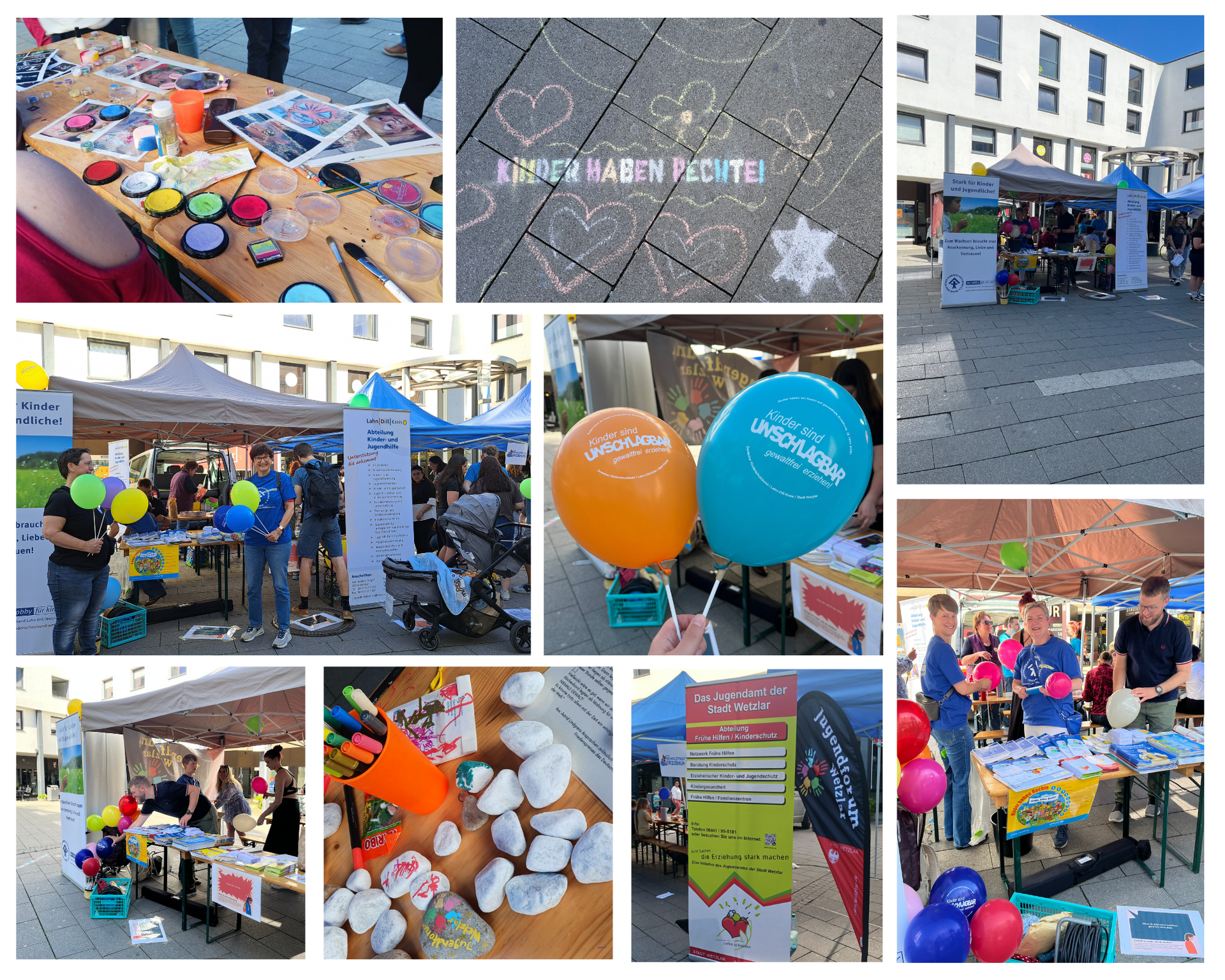 Auch wir vom Kinderschutzbund Lahn-Dill/Wetzlar waren mit einem Stand dabei und konnten zahlreiche kleine und große Besucher:innen begrüßen. Die Kinder konnten bei uns Mäppchen bunt gestalten und ihrer Kreativität freien Lauf lassen. Außerdem konnten sie mit ihrem Fingerabdruck auf einer Leinwand ein Zeichen für ihre Rechte setzen - ein starkes Symbol dafür, dass jedes Kind wichtig ist und Rechte hat, die es zu schützen gilt.