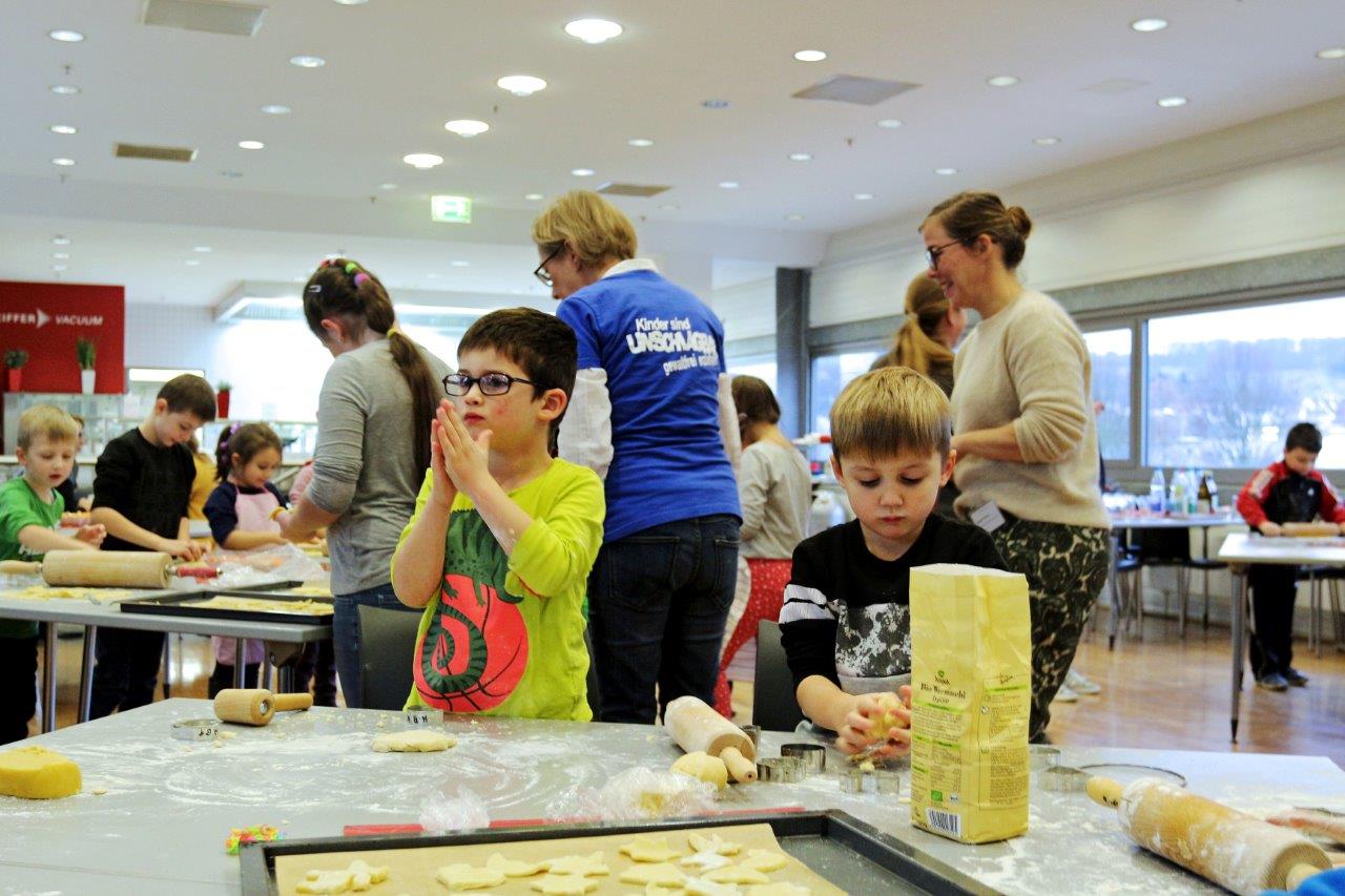 Kinder aus Asslar haben gemeinsam mit Vorstandsmitgliedern des Kinderschutzbundes und Mitarbeiter*innen von Pfeiffer Vacuum im dortigen Betriebsrestaurant Plätzchen gebacken, sowie kleine Geschenktüten gebastelt.