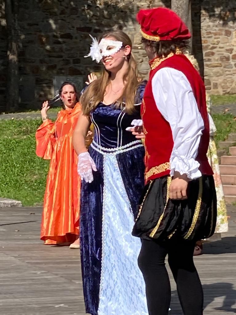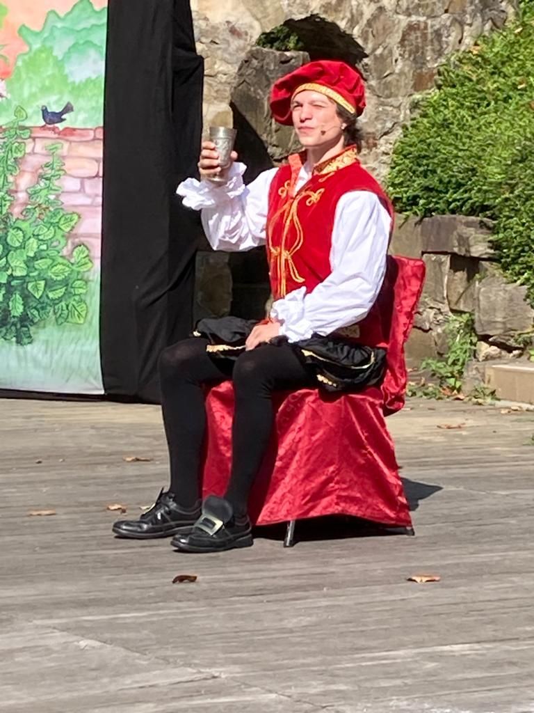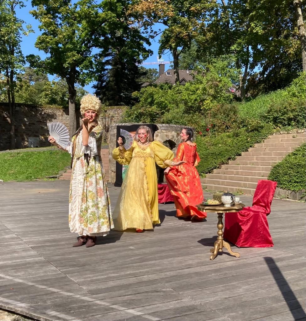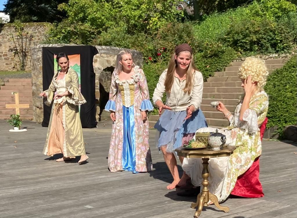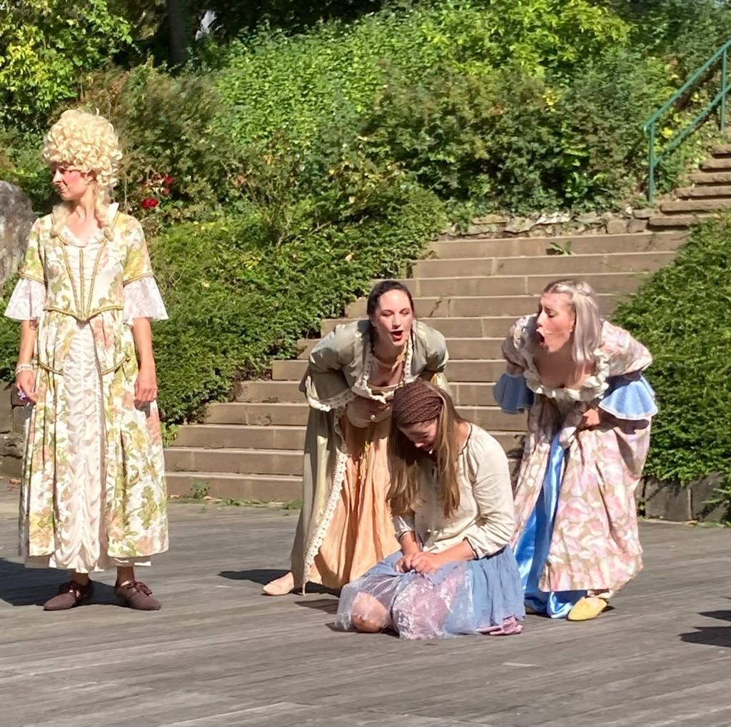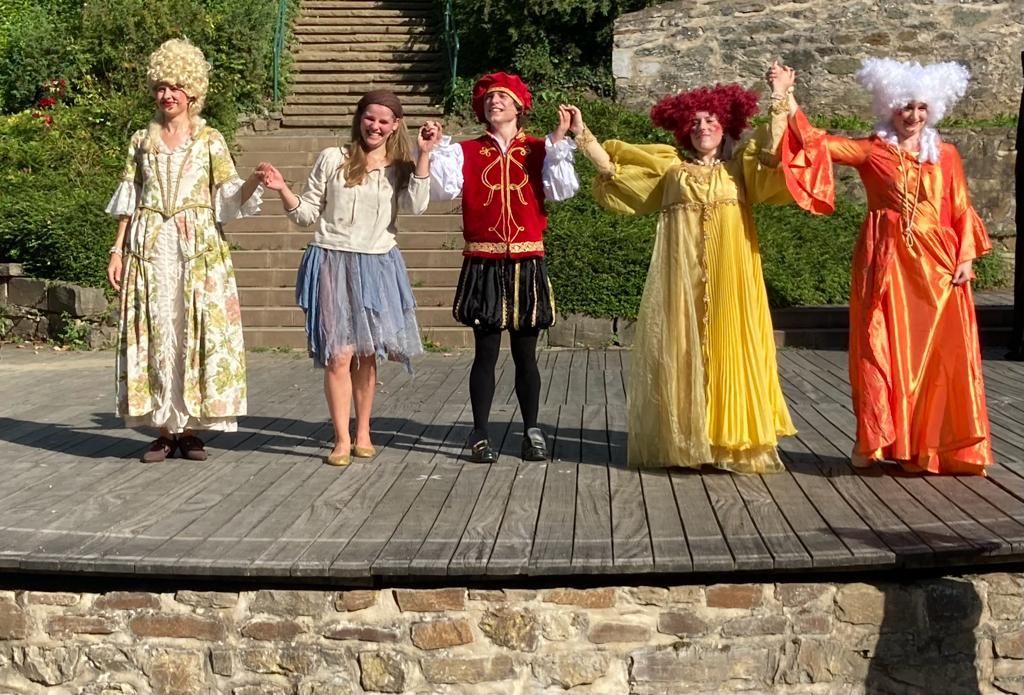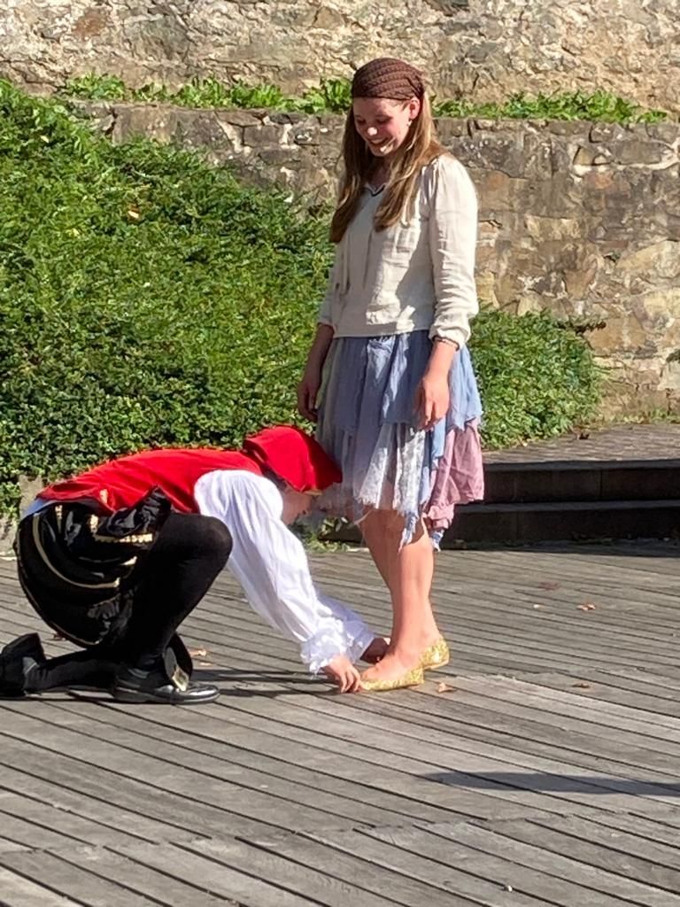 Bei hochsommerlichen Temperaturen durften dann alle Zuschauerinnen und Zuschauer erleben, wie boshaft Stiefmutter (Lara Sturm) und Stiefschwestern (Sophie Braumann und Eyleen Grisar) dem armen Aschenputtel (Lisa Hammann) zusetzten, bevor diese nach zähem Kampf und mit der Hilfe von verzauberten Täubchen zuerst wunderschöne Ballkleider und schließlich das Herz des Prinzen (Sebastian Schwarzkopf) eroberte.