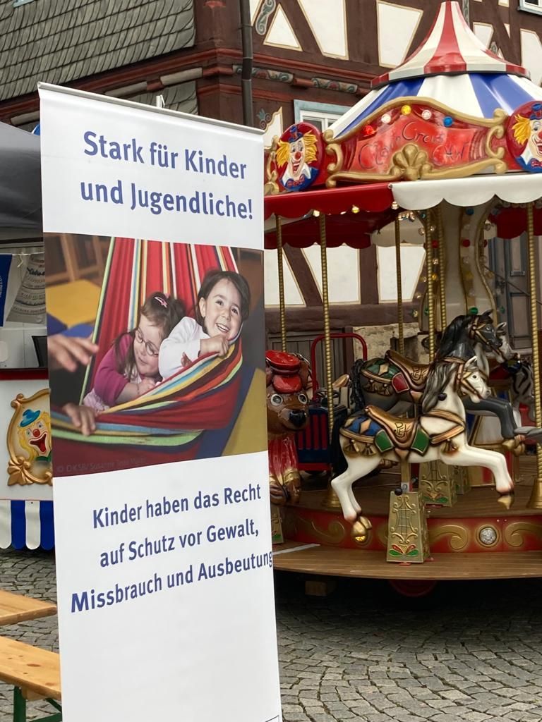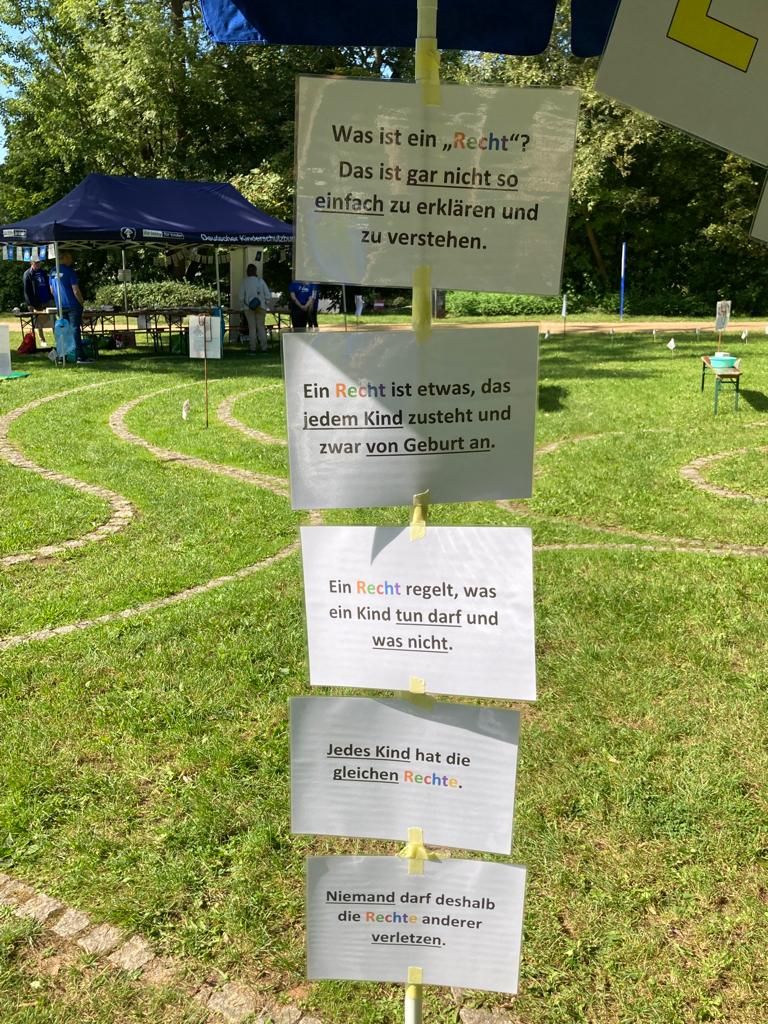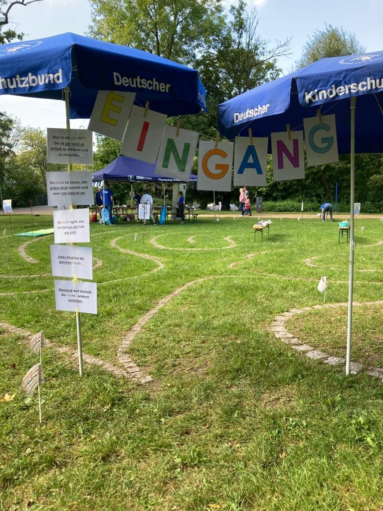 Natürlich war auch der Kinderschutzbund Lahn-Dill/Wetzlar mit einem großen Stand vertreten. Die Mitarbeiterinnen hatten sich in diesem Jahr verstärkt dem Thema „Kinderrechte“ angenommen und entlang des Labyrinths einen Parcours der Kinderrechte arrangiert. Hier konnten nun die Kinder allein, mit Begleitung oder Führung, erarbeiten und erleben, welche Rechte Kindern und Jugendlichen weltweit zustehen und was im Einzelnen darunter zu verstehen ist.